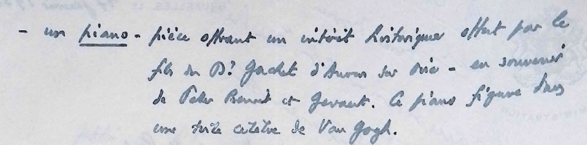 But how is this short story of a well-known work of art connected to the MIM? Once again, the archives come to the rescue! In 1952 the MIM received a donation of a piano described as “a piece offering historical interest donated by the son of Dr. Gachet of Auvers-sur-Oise – in memory of Peter Benoit and Gevaert. This piano is seen in a famous painting by Van Gogh.”