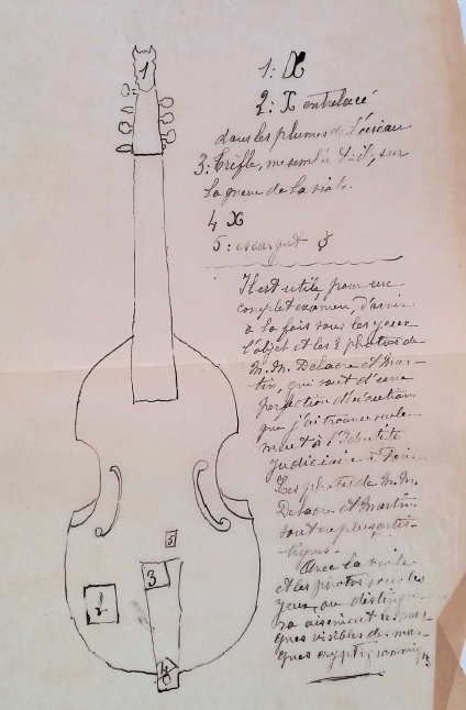 It is very useful, in order to perform a complete examination, to have the object and the two photographs by Mr. Delacre and Martin at hand, [the photographs] are of a degree of execution which I have only found at the Institute Judiciaire in Paris. The photographs of Mr. Delacre and Martin are more artistic. With the viola da gamba and the photographs under your eyes, one can easily distinguish the visible cryptographic signs.