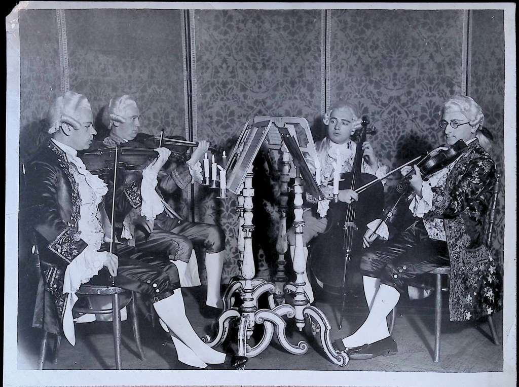 The famous Gottesmann Quartett during the performances, playing Haydn Music in costumes of the Haydn time. Professor Hugo Gottesmann can be seen on the left. The Quartett is giving some concerts in New York shortly sailing for the U.S.A. on the 17th June.