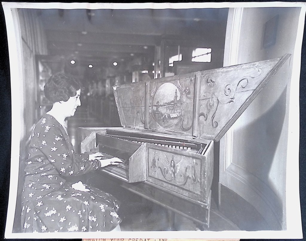 This Italian spinet, believed to be the oldest piano in existence, a part of the collection of 200 given to the National Museum at Washington, D.C., by Hugo Warch. It was manufactured in 1475, and has wooden keys which make direct contact with the sound strings. Mrs. Leta B. Loos, curator, is show at the instrument.